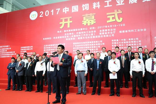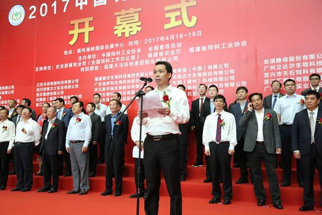 上图为全国畜牧总站站长、中国饲料工业协会秘书长杨振海主持展会开幕式
