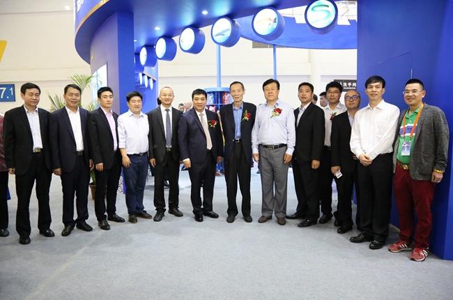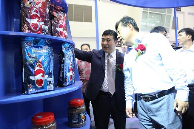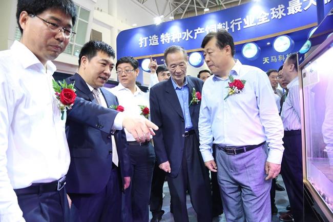 上图为陈庆堂董事长向于康震副部长,农业部原副部长、中国饲料工业协会顾问高鸿宾等领导介绍好博(中国)科技产品及相关水产品