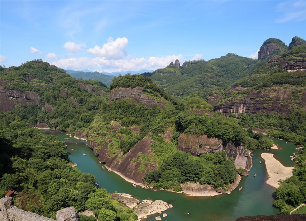 登山之后,大家乘坐古朴竹筏荡入武夷山山光水色之中,沿九曲溪随波逐流而下,体验唯美与刺激的碰撞。溪面忽而平缓似池,忽而湍急如潮,竹筏随之或珊珊而行,有惊无险中,两岸美景走马观花尽收眼底。无登山之劳,有涉水之乐,抬头山景源源而来,俯首水色飘拂而去,有一种“人在画中游”的感觉。夜幕降临时,大家还观看了全世界唯一展示中国茶文化的大型山水实景演出《印象大红袍》,领略了夜色中的武夷山之美,在恢宏壮阔的场景中深入体验了不同的武夷“山水茶”文化。