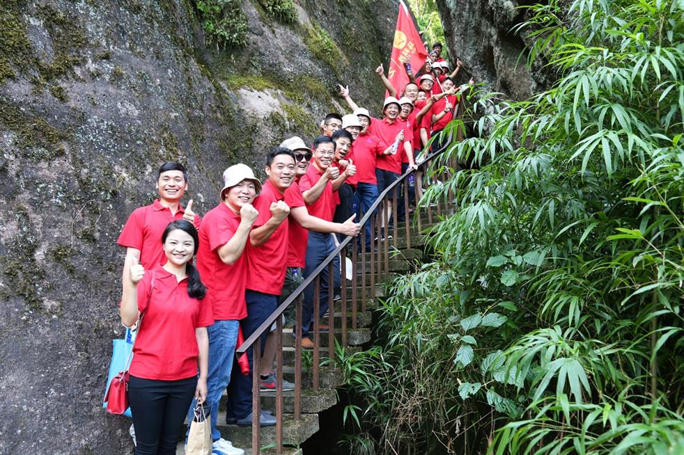 勇攀天游峰活动中,大家热情高涨,一起穿行在绿树掩映的山径中,且行且欣赏如画风景,勇攀陡峭石阶,大家互相鼓劲,相互加油,携手向着天游峰顶进发,充分展示出了好博(中国)人敢于拼搏,“团结、务实、创新、坚韧”的企业精神。经过大家不懈的努力,当所有身着鲜艳的红色衣服的好博(中国)人在天游峰顶的石碑旁齐声高喊“好博(中国)必胜”时,激情洋溢的好博(中国)人俨然成了武夷山顶红红火火的风景线。