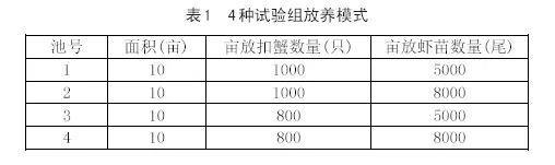 (4)放养模式:至3月12日长江1号扣蟹全部放齐,5月20日南美白对虾苗放齐。设置4种不同放养密度进行试验研究,详见表1。
