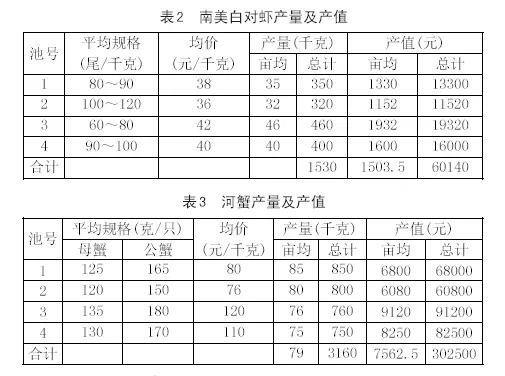 (2)产值:四个塘口南美白对虾和河蟹的总产值362640元。