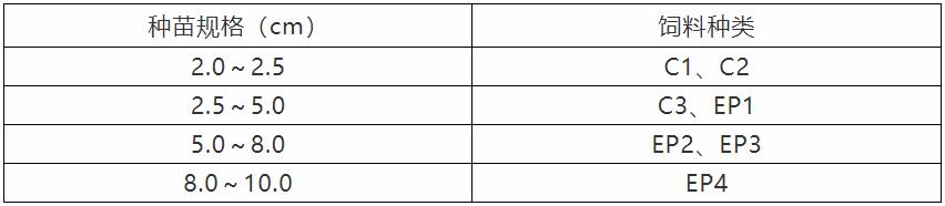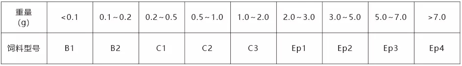 饲料适口性对石斑鱼摄食及采食量产生很大影响,而饲料颗粒大小占饲料适口性很大一部分,在不同体重下对应饲料规格见下表。